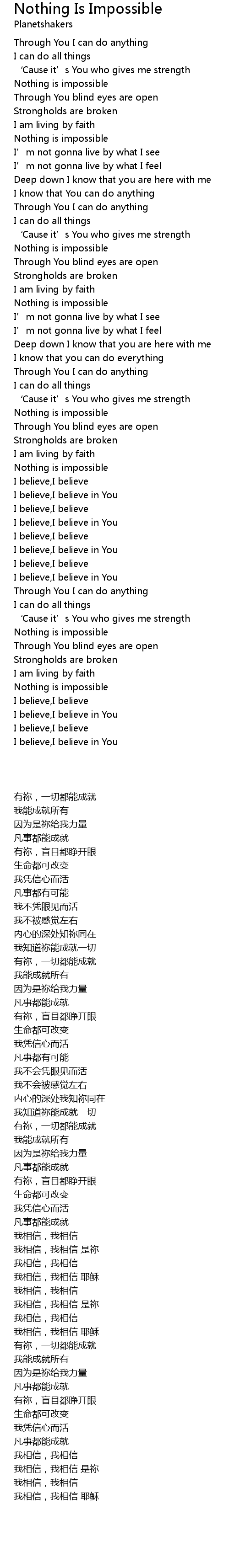 | [00:08.38] | ' Cause it' s You who gives me strength |