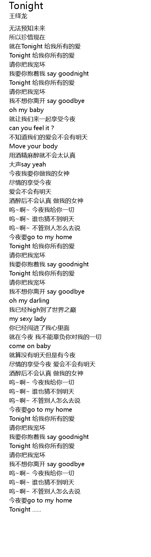 | [00:15.15] | Tonight gěi wǒ nǐ suǒ yǒu de ài |