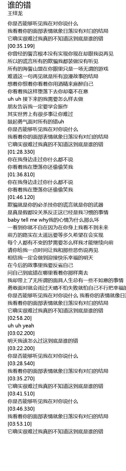 | [02:50.910] | tā què shí hěn nán guò wǒ zhēn de bù zhī dào zhè dào dǐ shì shuí de cuò |