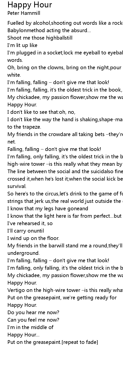 | I' m falling, only falling, it' s the oldest trick in the book, vertigo on the highwire tower is this really what they mean by " Happy Hour"? | |