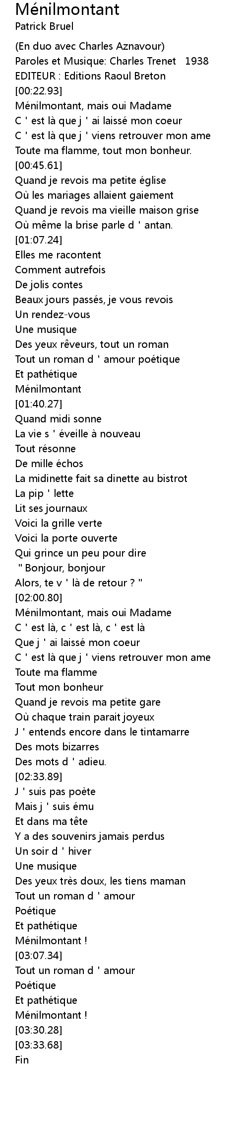 | [02:01.56] | Ménilmontant, mais oui Madame |