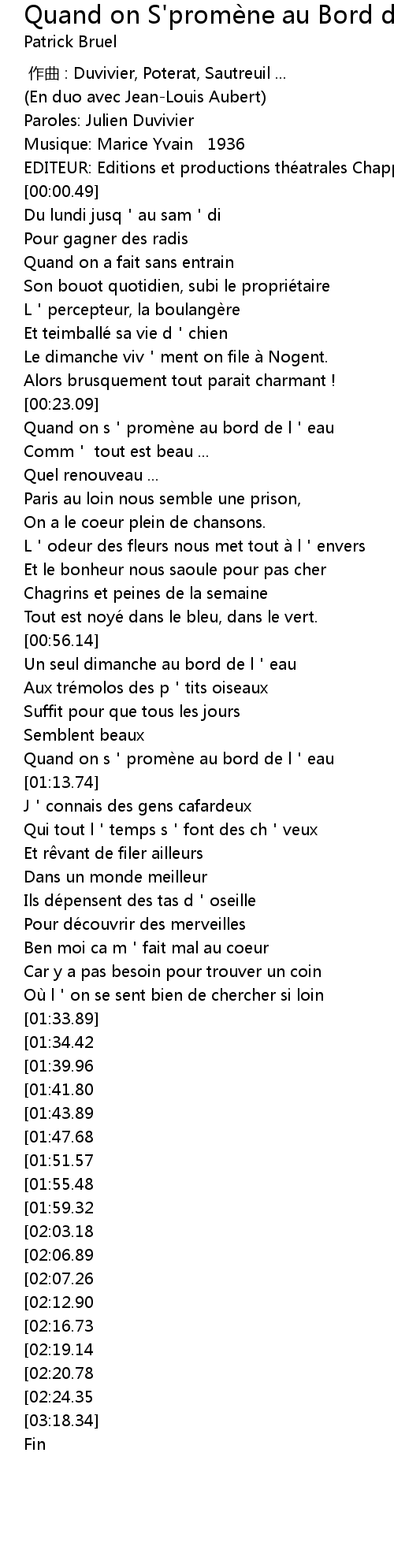 | [02:24.64][01:34.42] | Quand on s promè ne au bord de l eau |
