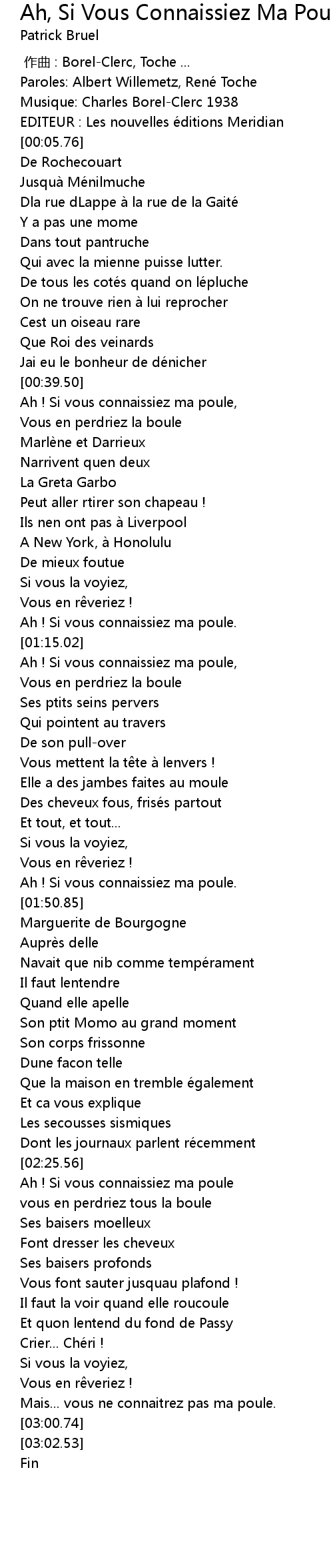| [02:26.11] | Ah ! Si vous connaissiez ma poule |