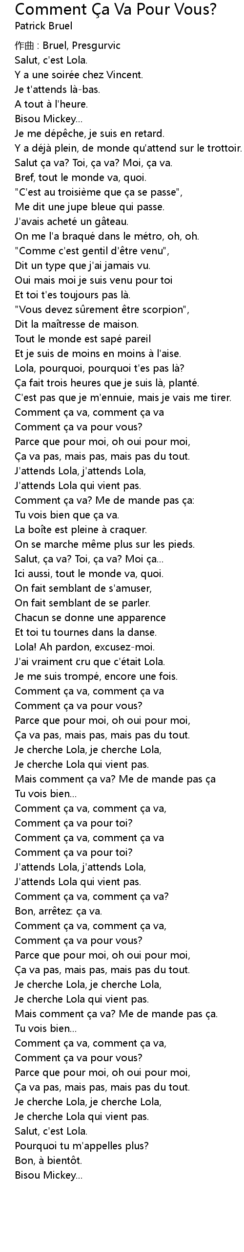 | Salut ça va? Toi, ça va? Moi, ça va. | |