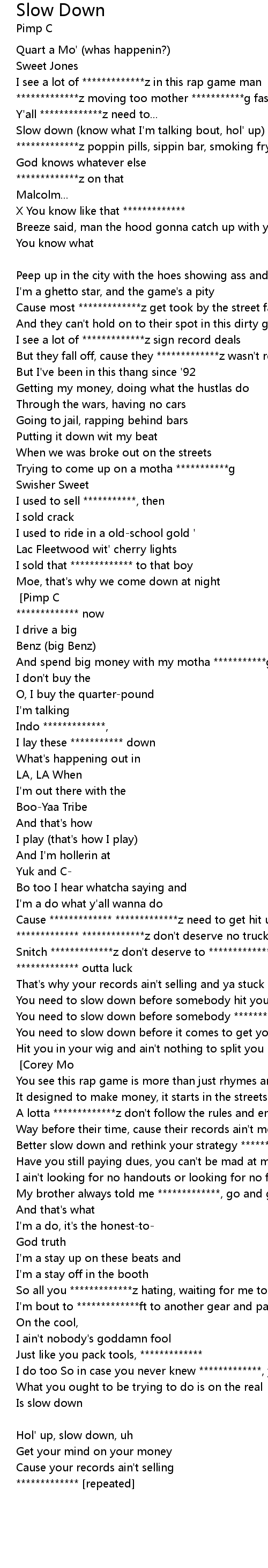 Slow down (know what I'm talking bout?) [repeated] [Pimp C] |
