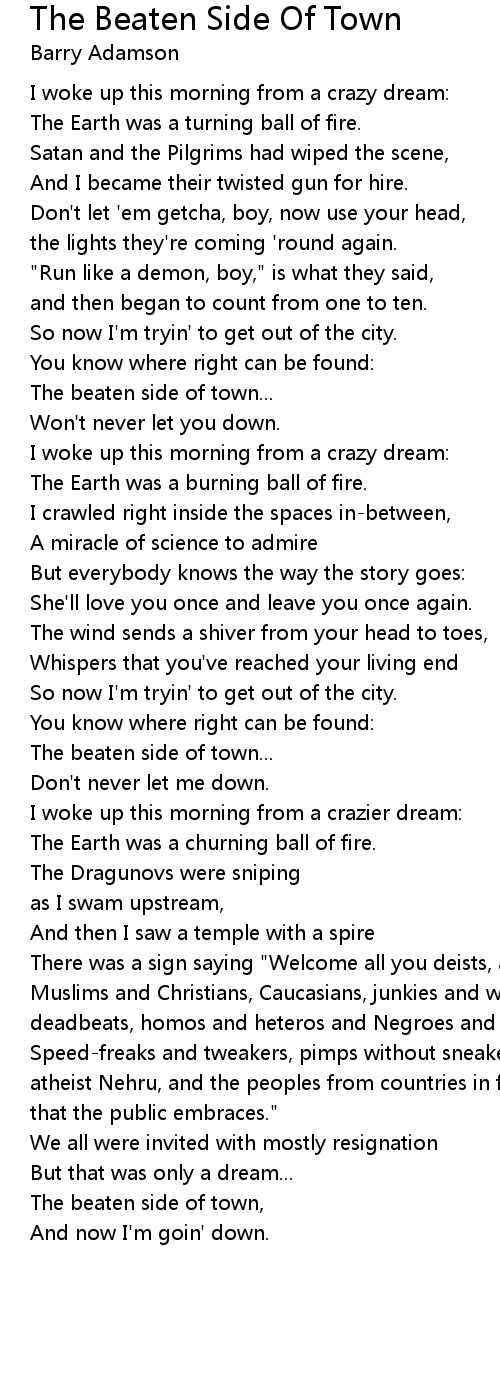Speed-freaks and tweakers, pimps without sneakers, the handy the pure and the atheist Nehru, and the peoples from countries in far-away places, stupid ideas that the public embraces." |