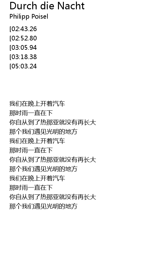 | [04:16.00][02:43.26][01:32.00] | Und wir fahr' n mit deinem Auto durch die Nacht. |