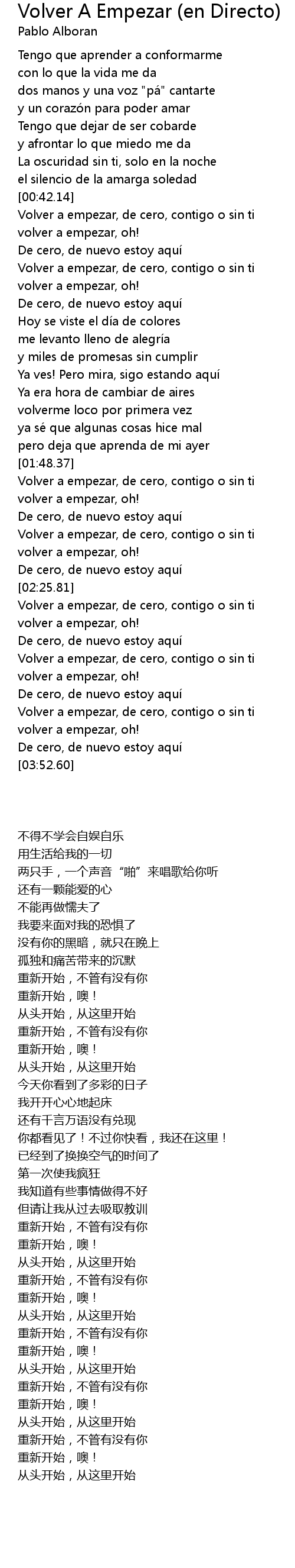 | [00:49.86] | Volver a empezar, de cero, contigo o sin ti |