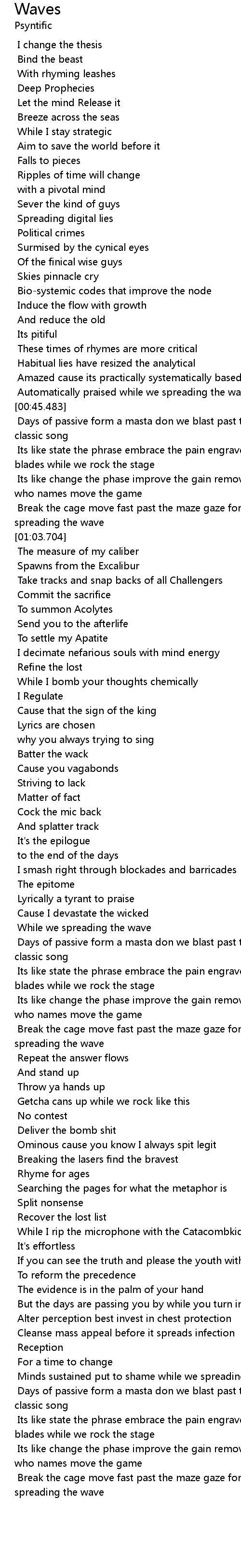 | [00:59.263] | Break the cage move fast past the maze gaze for days in praise we spreading the wave |