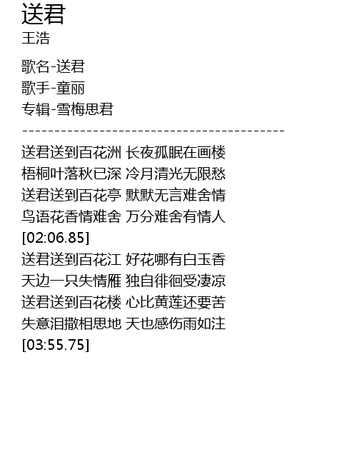 | [00:52.76] | 送君送到百花洲 长夜孤眠在画楼 |