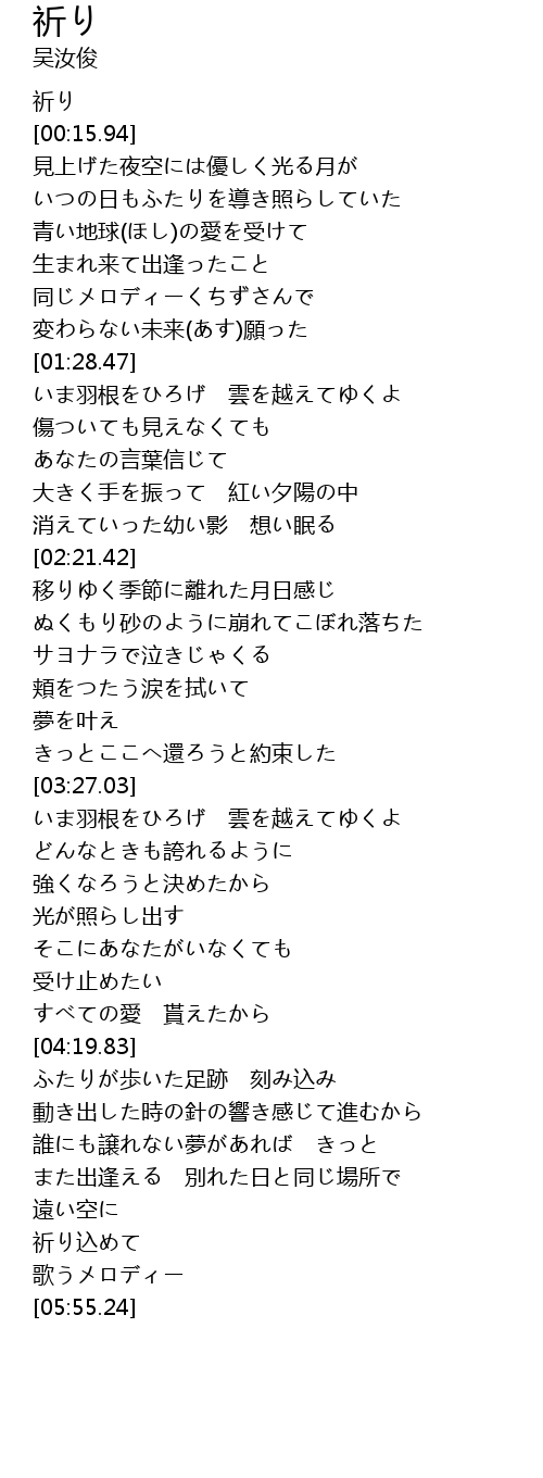 | [01:30.17] | いま羽根をひろげ 雲を越えてゆくよ |
