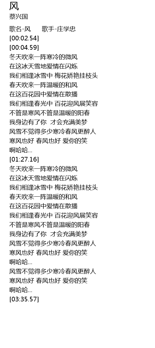 | [00:00.38] | 歌名-风 歌手-庄学忠 |