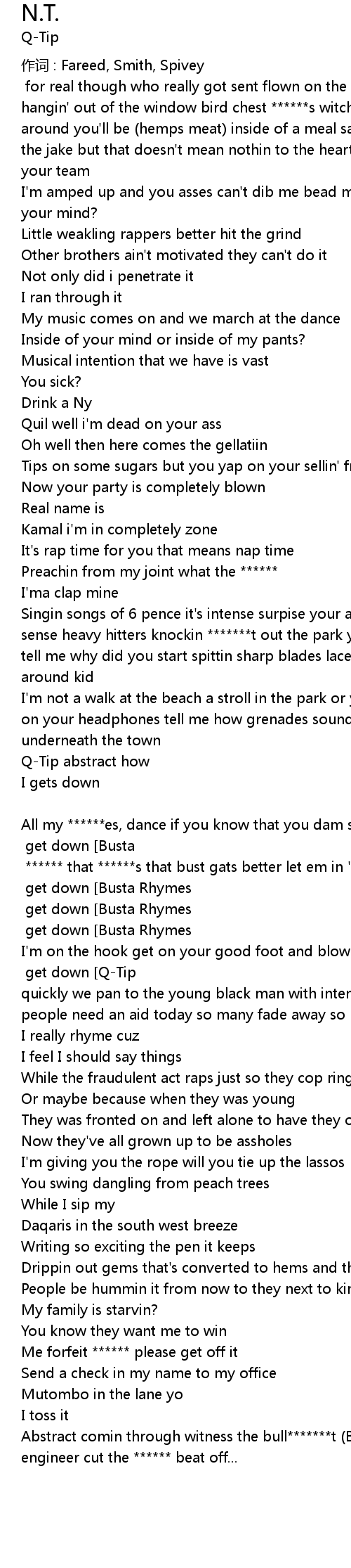 | Let your ******* drip on the dance floor if you wanna [Q-Tip] get down [Busta Rhymes] ****** that ******s that bust gats better let em in 'fore they rush that cuz they wanna [Q-Tip] get down [Busta Rhymes] blick *******t piano sick *******t [Q-Tip] get down [Busta Rhymes] chill you can get off my ****** and [Q-Tip] get down [Busta Rhymes] while | |