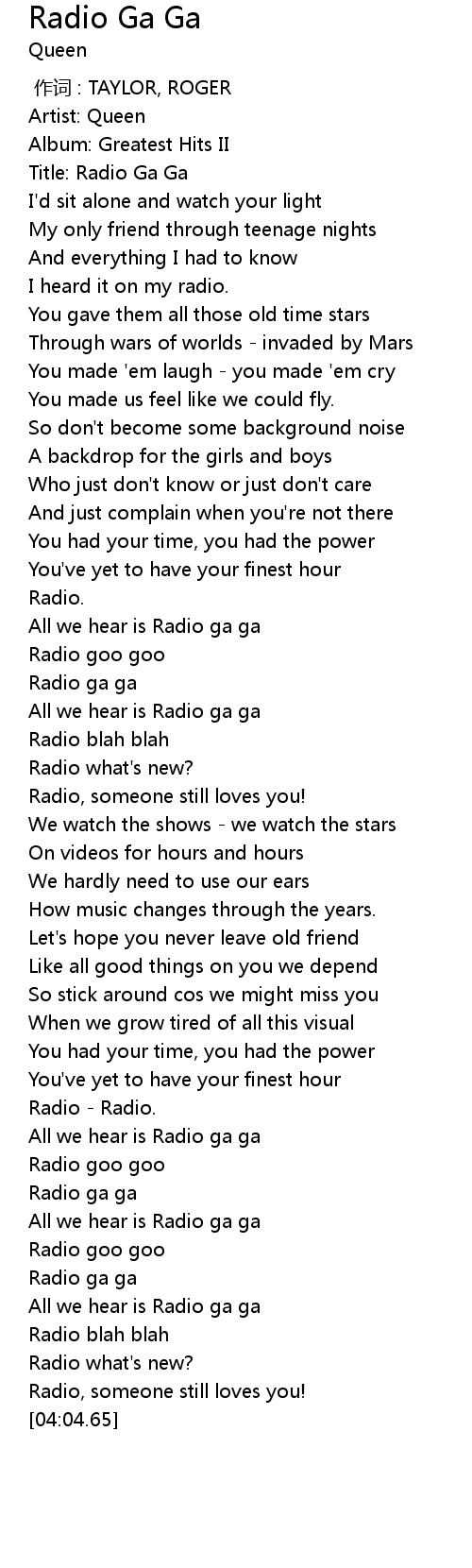 | [00:03.88] | Title: Radio Ga Ga |