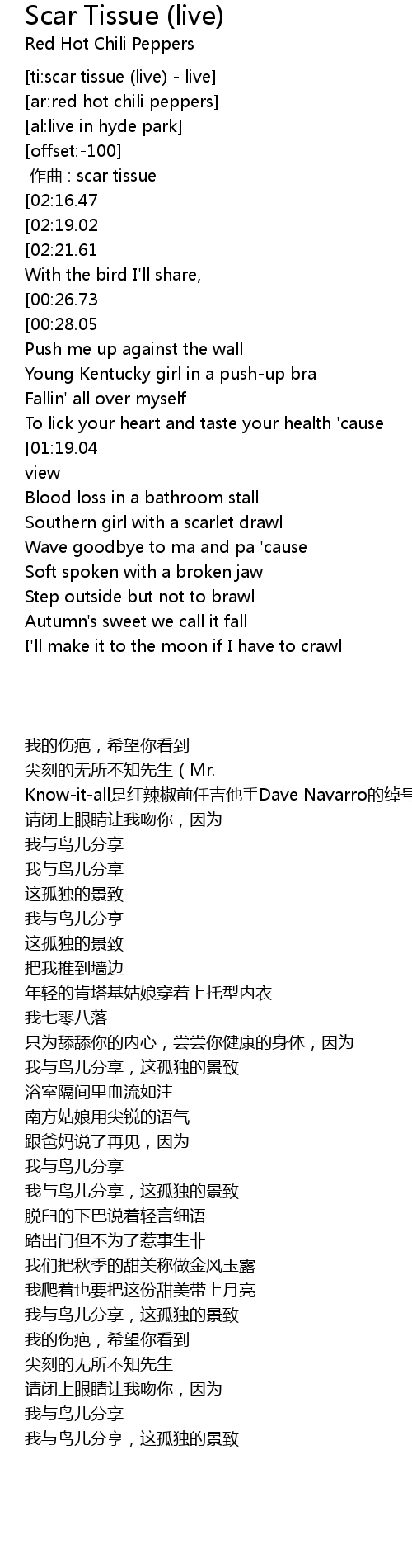 | [00:11.20][02:16.47] | Scar tissue that I wish you saw |