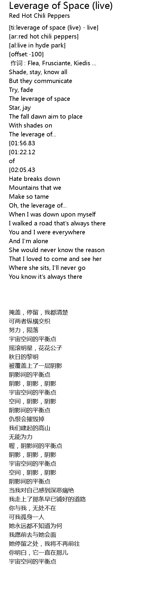 | [00:00.00] | 作词 : Flea, Frusciante, Kiedis ... |