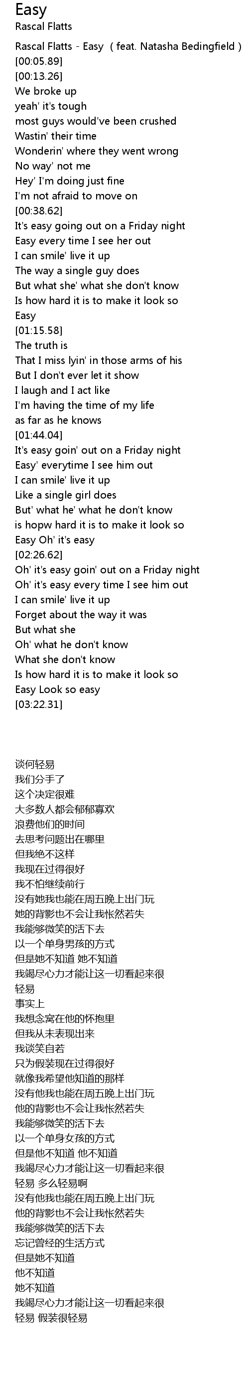 | [00:01.12] | Rascal Flatts - Easy (feat. Natasha Bedingfield) |