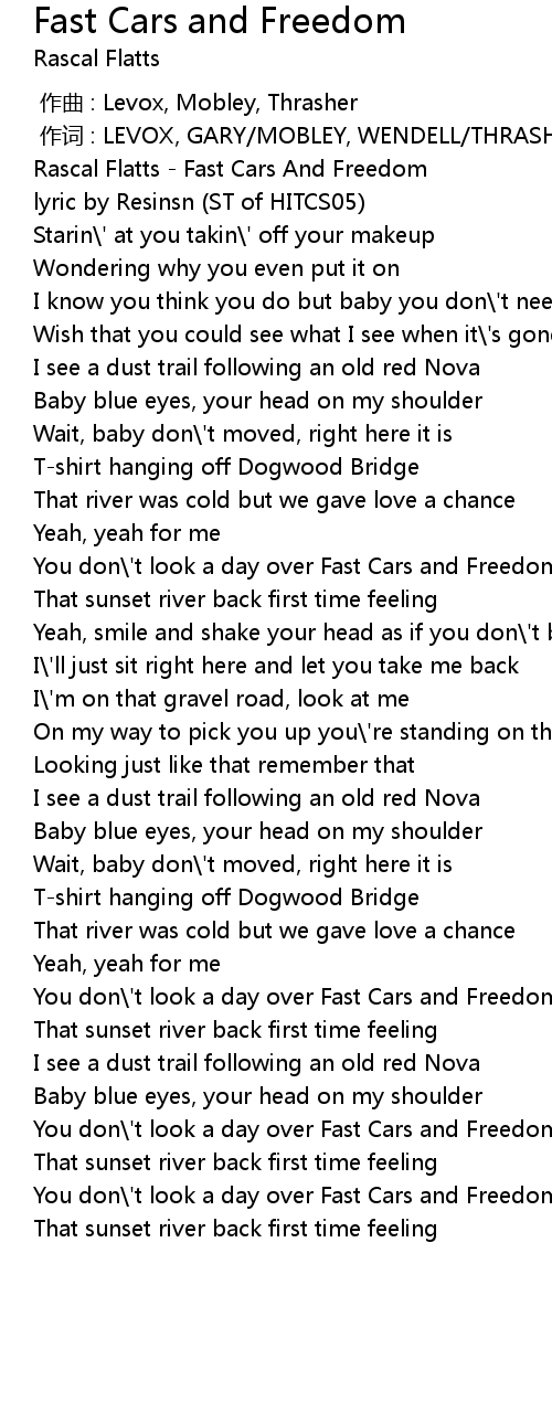 | [00:10.72] | Rascal Flatts - Fast Cars And Freedom |