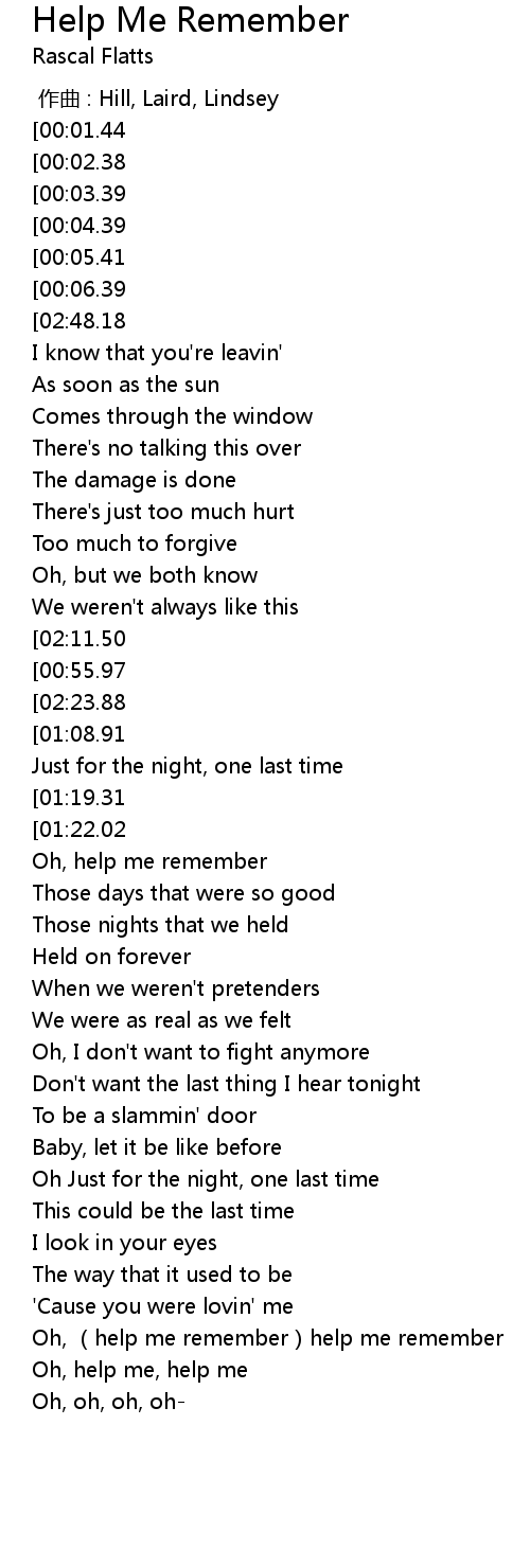 | [03:03.29][02:11.50][00:49.60] | Help me remember |