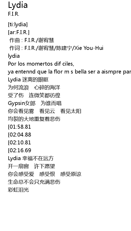 | [00:00.03] | zuò cí : F. I. R. xiè yòu huì chén jiàn níng Xie YouHui |