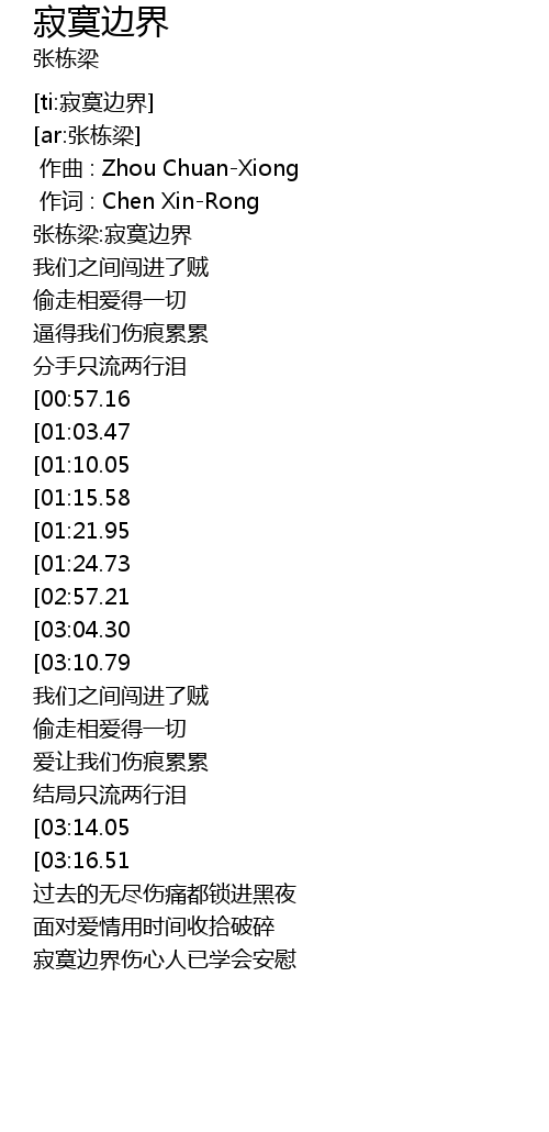 | [00:00.00] | 张栋梁:寂寞边界 |