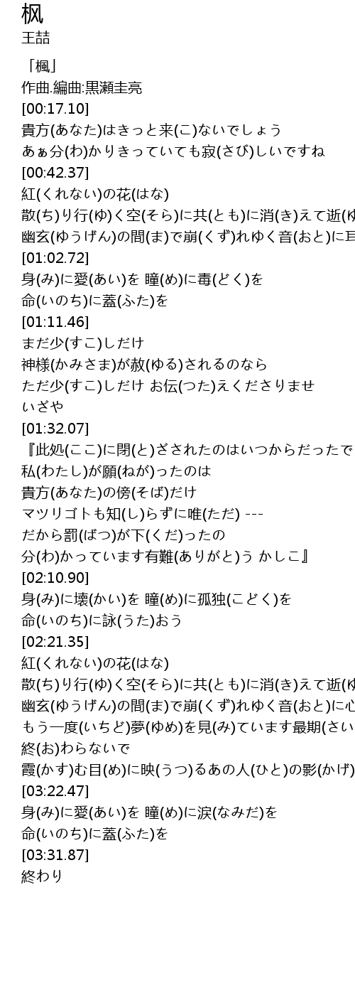 | [00:42.87] | 紅(くれない)の花(はな) 散(ち)り行(ゆ)く空(そら)に共(とも)に消(き)えて逝(ゆ)きます |