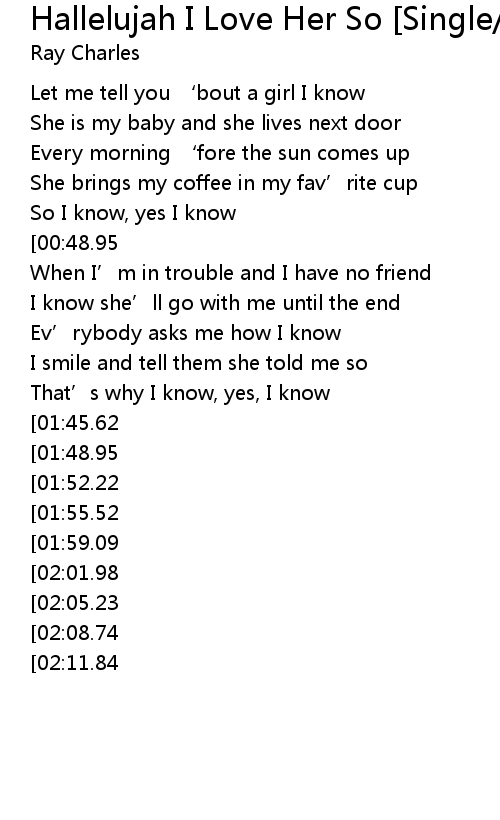 | [00:29.59][00:48.95][01:21.67][02:14.71] | Hallelujah I just love her so |