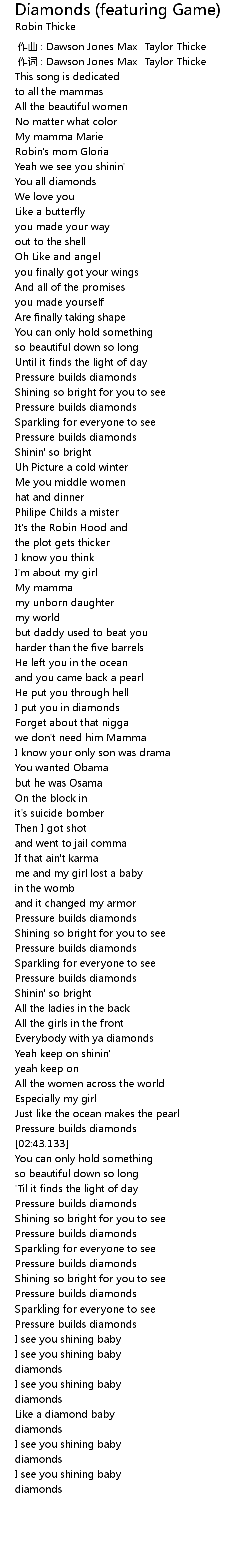 | [02:28.728] | Everybody with ya diamonds |