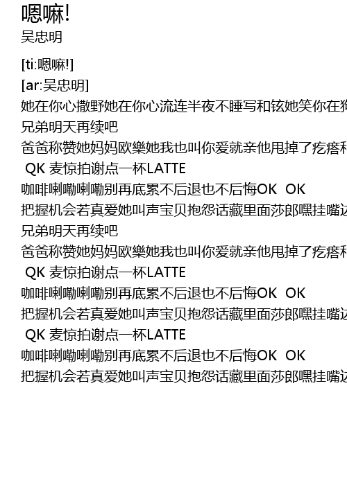| [02:26.530] | 爸爸称赞她妈妈欧樂她我也叫你爱就亲他甩掉了疙瘩和她谈梦想整装出发约她送花不要怕妹妹称赞她阿姑欧樂她爱要认真就别再跑趴QK QK 麦惊拍谢点一杯LATTE 咖啡喇嘞喇嘞别再底累不后退也不后悔OK OK 把握机会若真爱她叫声宝贝抱怨话藏里面莎郎嘿挂嘴边这幸福抓住无限续杯````QK QK 麦惊拍谢点一杯LATTE 咖啡喇嘞喇嘞别再底累不后退也不后悔OK OK 把握机会若真爱她叫声宝贝抱怨话藏里面莎郎嘿挂嘴边这幸福抓住无限续杯 |