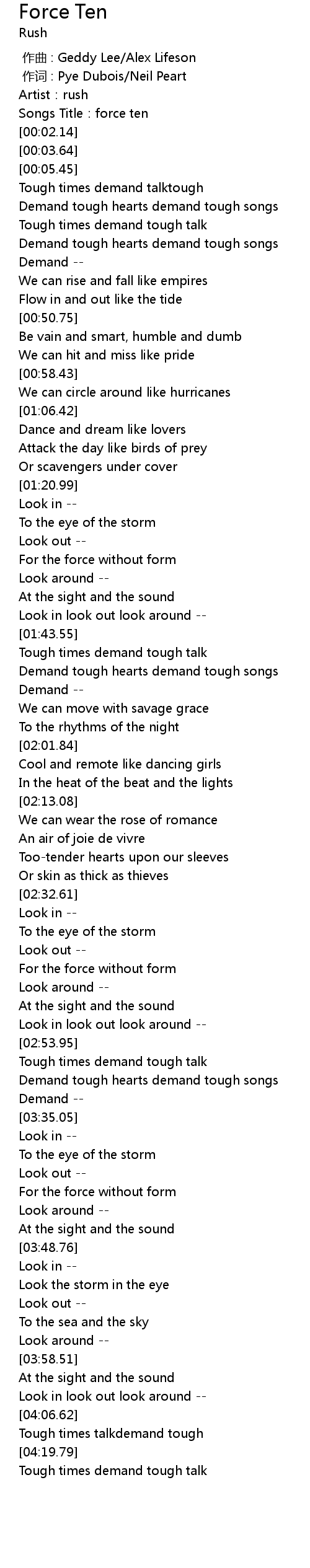 | [00:00.13] | 作词 : Pye Dubois/Neil Peart |