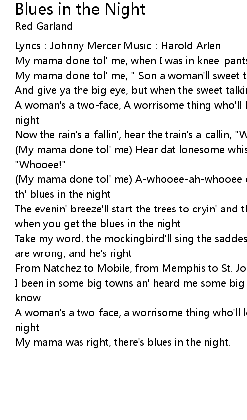 | A woman' s a twoface, a worrisome thing who' ll leave ya to sing the blues in the night | |