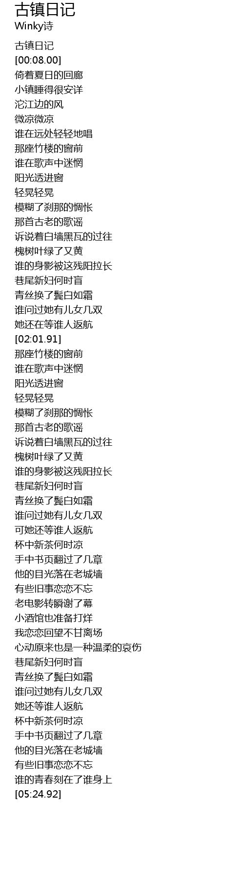 | [01:21.17] | 诉说着白墙黑瓦的过往 |
