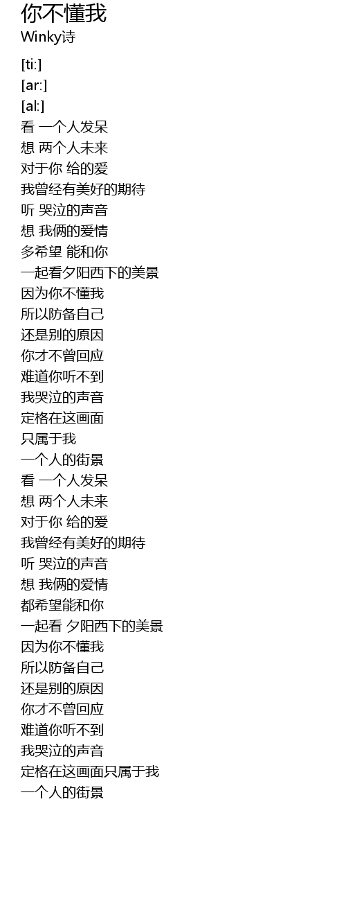 | [03:32.18] | yīn wèi nǐ bù dǒng wǒ |