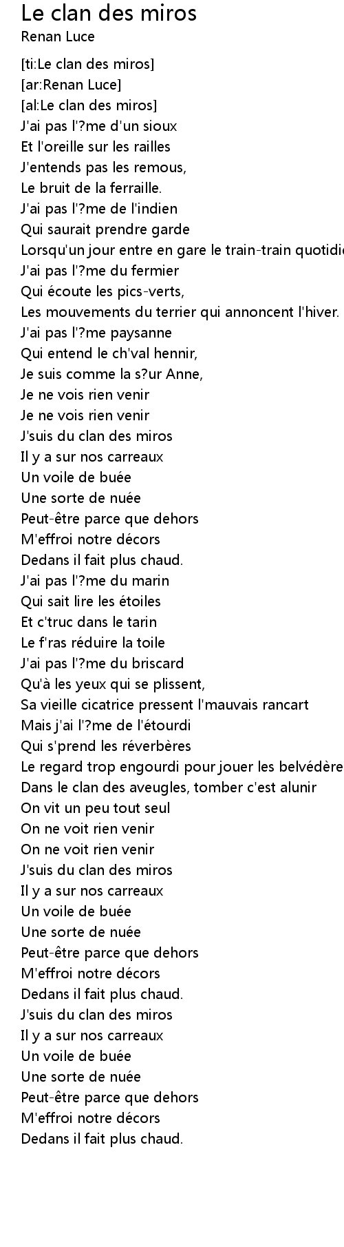 | [02:14.58] | Dans le clan des aveugles, tomber c'est alunir |