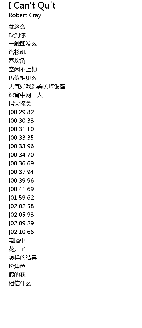| [02:13.85][01:59.62][01:17.67][00:43.83] | But I Can't I Can't Quit I Seek U |
