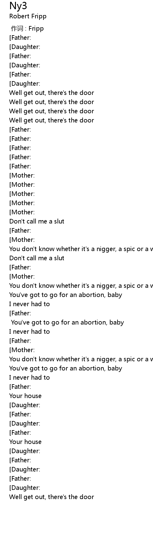 | [01:43.92] | You don' t know whether it' s a nigger, a spic or a white baby |