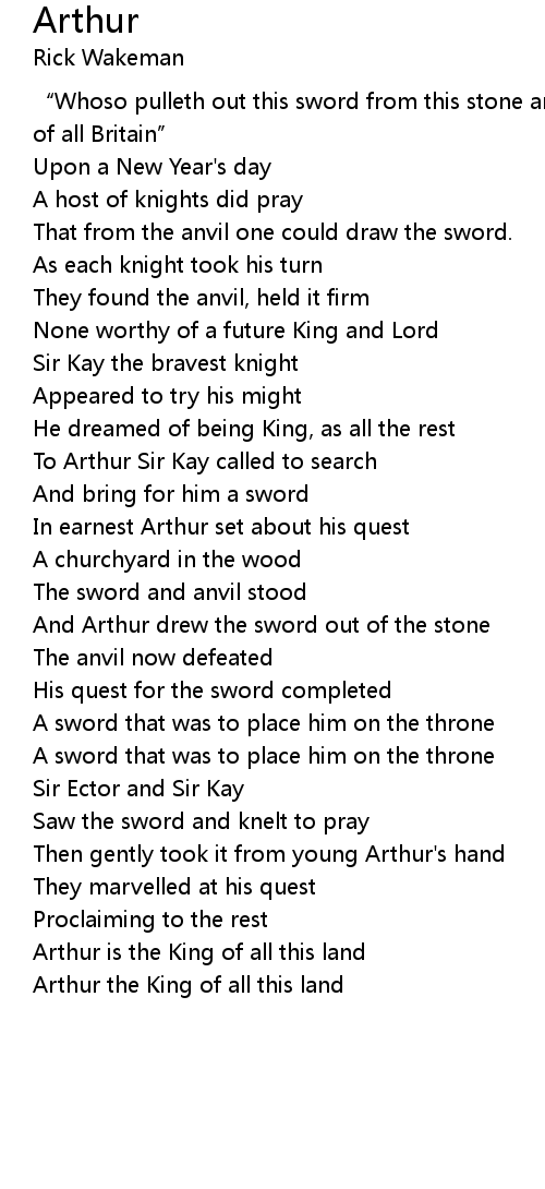 | " Whoso pulleth out this sword from this stone and anvil is the true born King of all Britain" | |