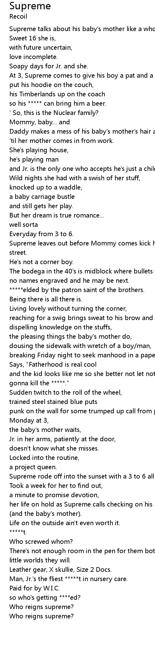 | Supreme leaves out before Mommy comes kick his lazy narrow behind back onto the street. | |