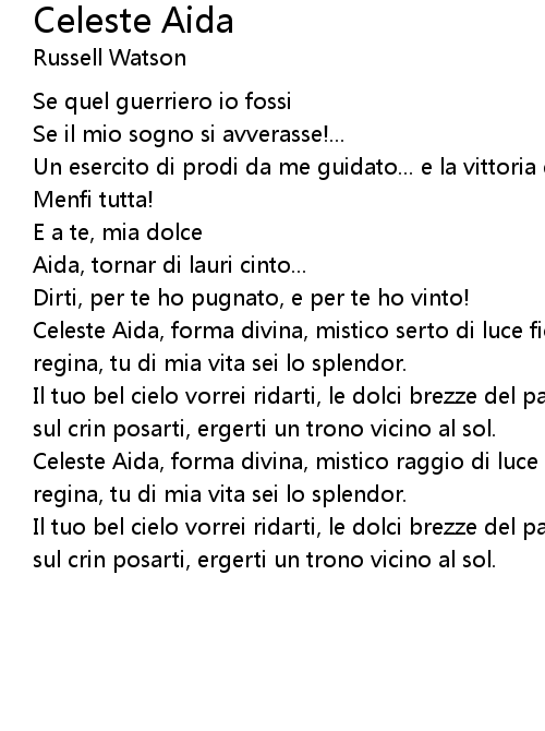 Celeste Aida, forma divina, mistico serto di luce fior, del mio pensiero tu sei regina, tu di mia vita sei lo splendor. |
