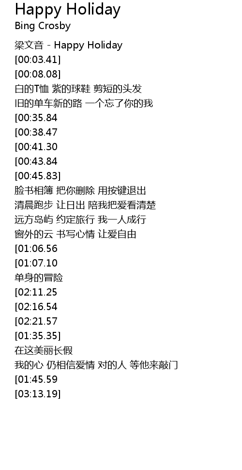 | [00:01.12] | liáng wén yīn Happy Holiday |