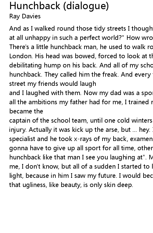 captain of the school team, until one cold winters afternoon I sustained an injury. Actually it was kick up the arse, but ... hey. I was sent to a specialist and he took x-rays of my back, examened me and he said "Well you're gonna have to give up all sport for all time, otherwise you're going to end up a hunchback like that man I see you laughing at". Maybe that was meant to scare me, I don't know, but all of a sudden I started to look at that freak in a new light, because in him I saw my future. I would become a freak. But we all know that ugliness, like beauty, is only skin deep. |