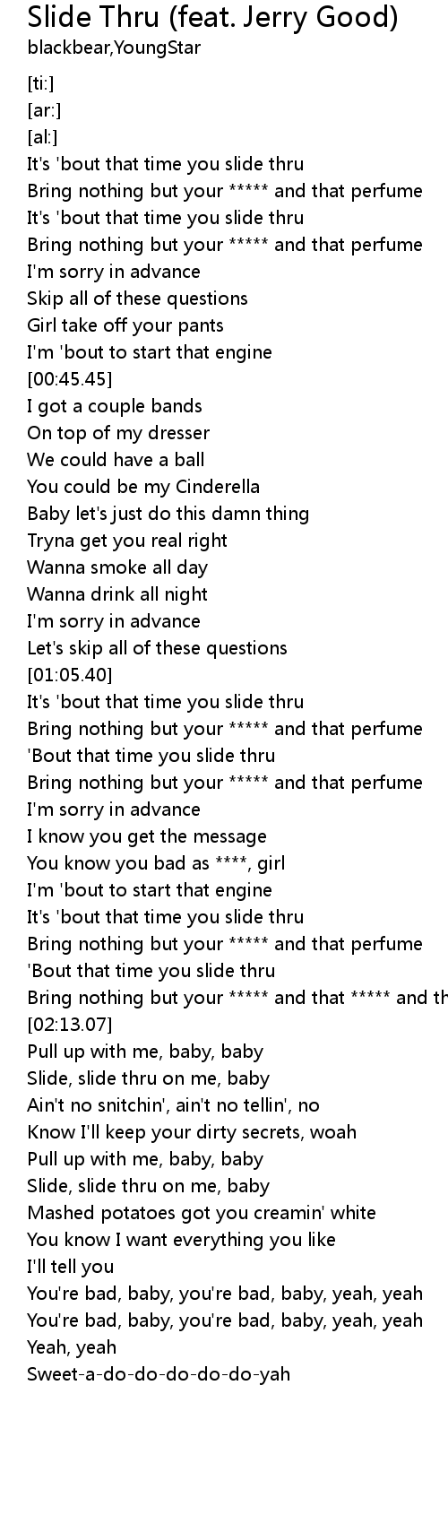 | [00:29.11] | Bring nothing but your ***** and that perfume |