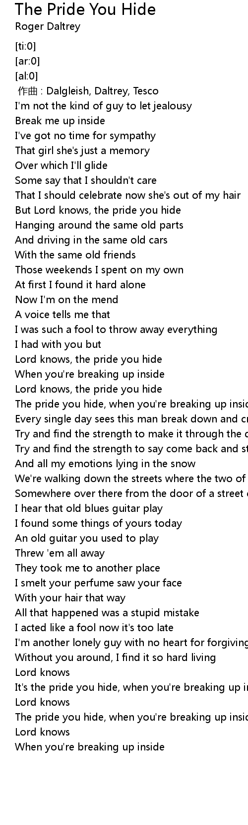 | [03:54.450] | The pride you hide, when you're breaking up inside |