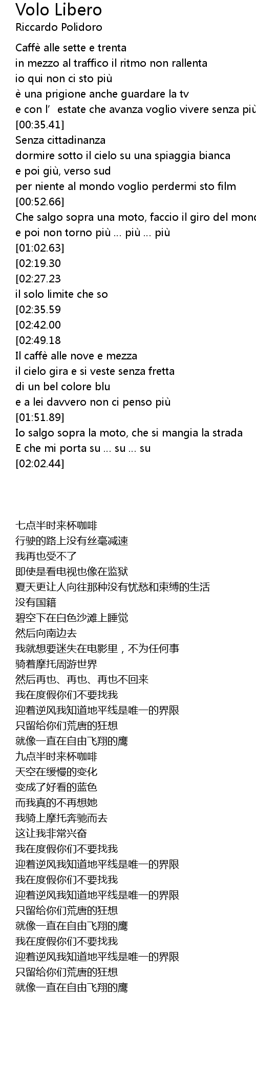 | [03:11.28][02:27.23][02:11.22][01:10.95] | Ho il vento in faccia e l’orizzonte è il solo limite che so |