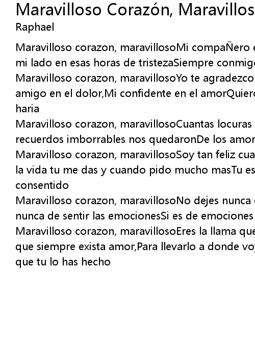 | Maravilloso corazon, maravillosoSoy tan feliz cuando yo siento tus latidosPorque la vida tu me das y cuando pido mucho masTu estas conmigo porque soy tu consentido | |