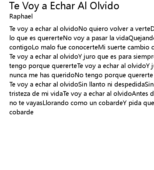 Te voy a echar al olvidoSin llanto ni despedidaSin nada que me recuerdeLa tristeza de mi vidaTe voy a echar al olvidoAntes de que sea muy tardeY pida que no te vayasLlorando como un cobardeY pida que no te vayasLlorando como un cobarde