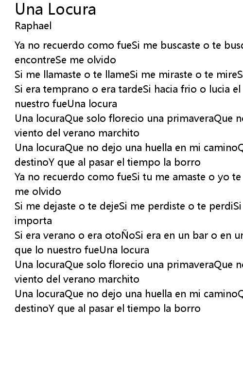 | Si era temprano o era tardeSi hacia frio o lucia el solSolo recuerdo que lo nuestro fueUna locura | |