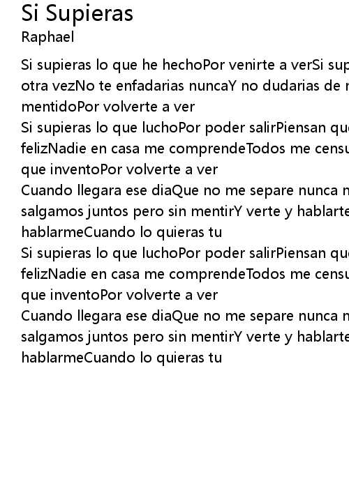 Si supieras lo que he hechoPor venirte a verSi supieras lo que he dichoPor verte otra vezNo te enfadarias nuncaY no dudarias de mi amor por tiSi supieras que he mentidoPor volverte a ver