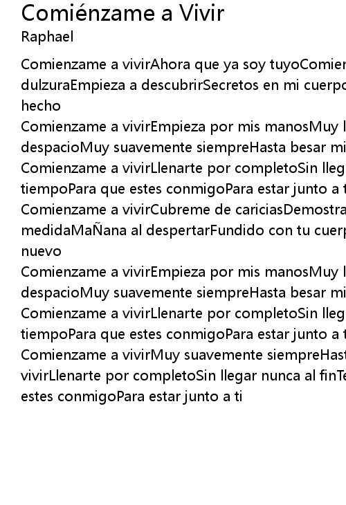 | Comienzame a vivirMuy suavemente siempreHasta besar mi bocaComienzame a vivirLlenarte por completoSin llegar nunca al finTenemos mucho tiempoPara que estes conmigoPara estar junto a ti |