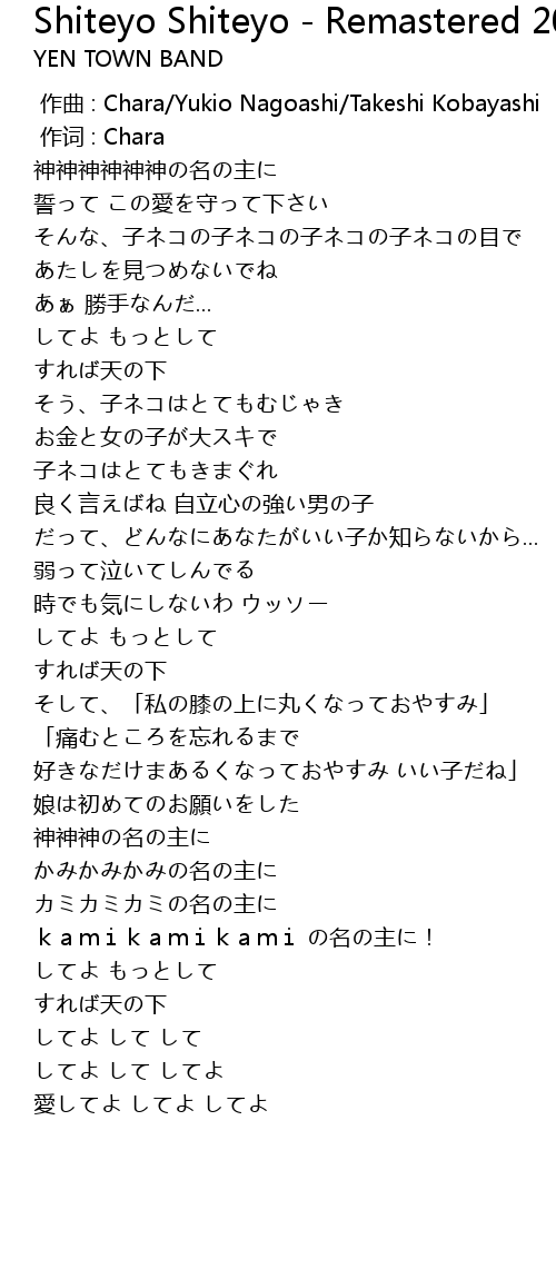 | [00:00.00] | 作曲 : Chara/Yukio Nagoashi/Takeshi Kobayashi |